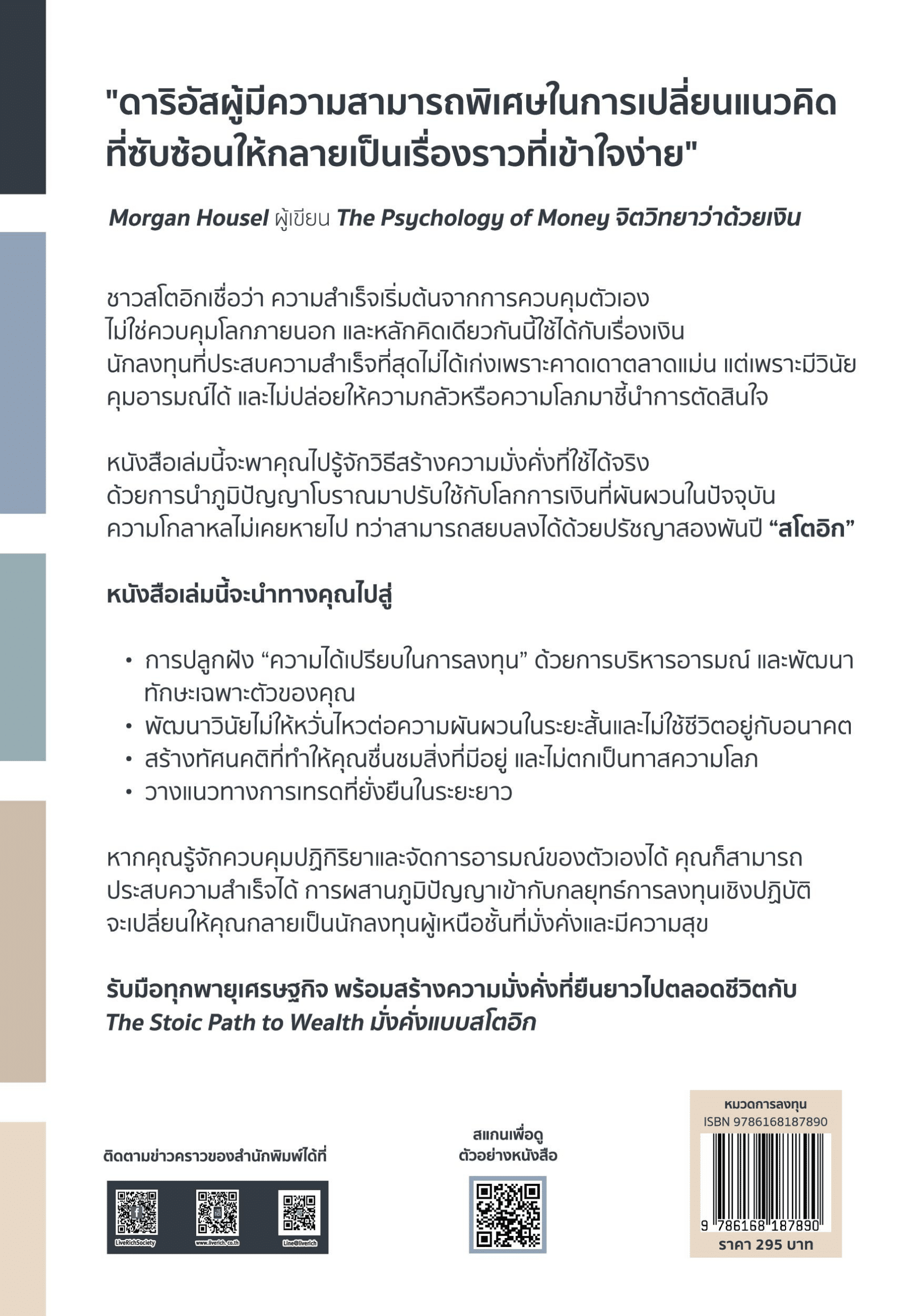 | จุดเด่น | • เปลี่ยนผู้อ่านจากนักลงทุนตามอารมณ์ให้กลายเป็นคนมีระบบและวินัย • ผสานปรัชญาสโตอิกกับการลงทุนยุคใหม่ เน้นการมั่งคั่งระยะยาว • ภาษาอ่านง่าย แต่ลึกถึงแก่น ไม่มีศัพท์เชิงเทคนิคซับซ้อน เล่าจากสถานการณ์จริง |
