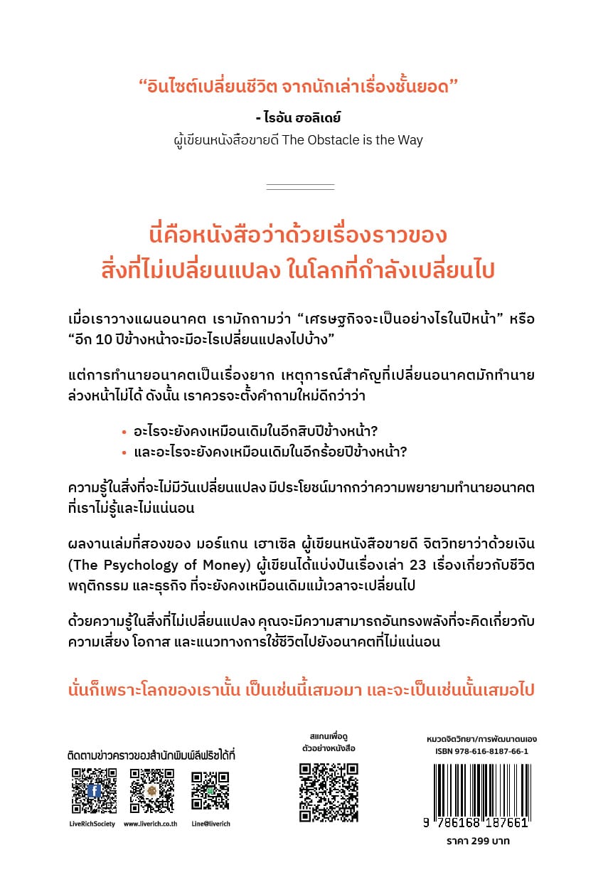 ผู้เขียน มอร์แกน เฮาเซิล ได้แบ่งปันเรื่องเล่า 23 เรื่อง เกี่ยวกับชีวิต พฤติกรรม และธุรกิจ ที่จะยังคงเหมือนเดิมแม้เวลาจะเปลี่ยนไป ด้วยความรู้ในสิ่งที่ไม่เปลี่ยนแปลง เราจะมีความสามารถอันทรงพลังที่จะคิดเกี่ยวกับความเสี่ยง โอกาส และแนวทางการใช้ชีวิตไปยังอนาคตที่ไม่แน่นอน